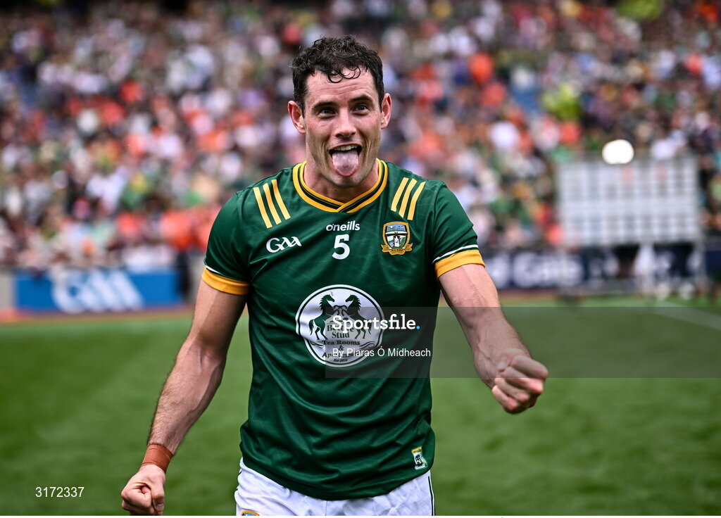 29 June 2025; Donal Keogan of Meath celebrates after his side's victory in the GAA Football All-Ireland Senior Championship quarter-final match between Meath and Galway at Croke Park in Dublin. Photo by Piaras Ó Mídheach/Sportsfile