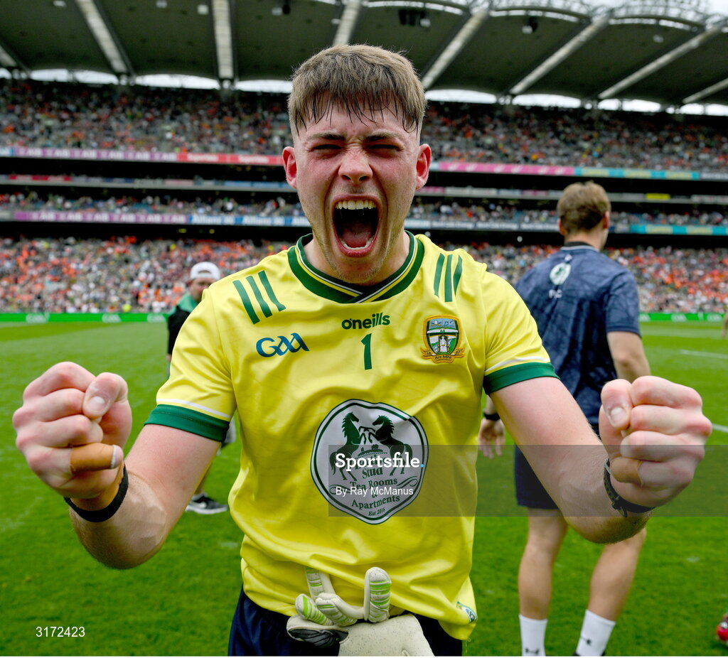 29 June 2025; Meath goalkeeper Billy Hogan celebrates after the GAA Football All-Ireland Senior Championship quarter-final match between Meath and Galway at Croke Park in Dublin. Photo by Ray McManus/Sportsfile