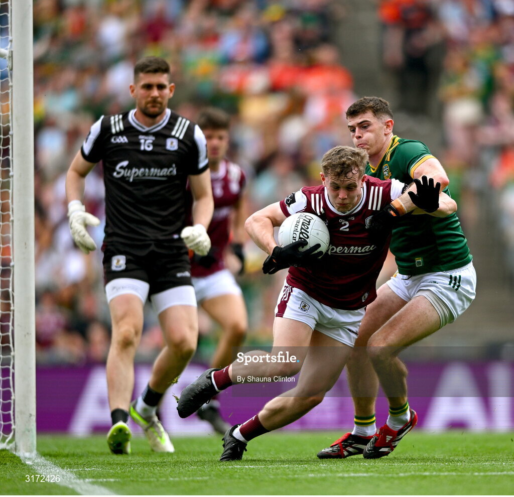 29 June 2025; Johnny McGrath of Galway in action against Eoghan Frayne of Meath during the GAA Football All-Ireland Senior Championship quarter-final match between Meath and Galway at Croke Park in Dublin. Photo by Shauna Clinton/Sportsfile