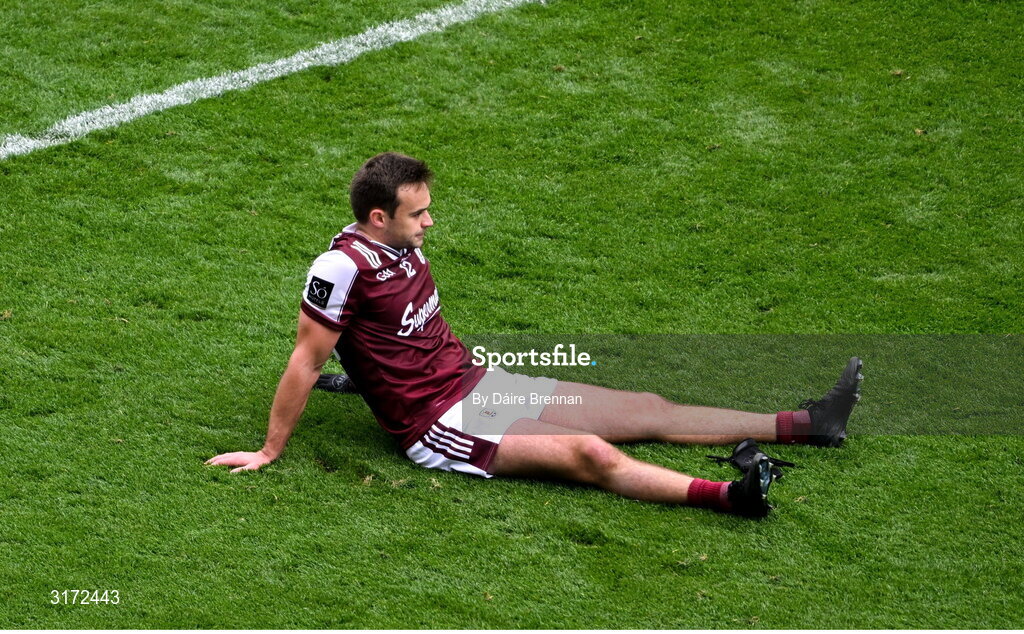 29 June 2025; A dejected Cillian McDaid of Galway after the GAA Football All-Ireland Senior Championship quarter-final match between Meath and Galway at Croke Park in Dublin. Photo by Daire Brennan/Sportsfile