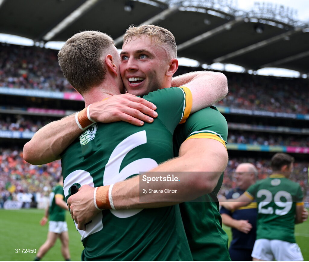 29 June 2025; Meath players Conor Gray, right, and Seán Coffey celebrate after the GAA Football All-Ireland Senior Championship quarter-final match between Meath and Galway at Croke Park in Dublin. Photo by Shauna Clinton/Sportsfile