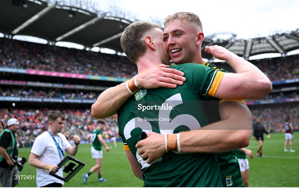 29 June 2025; Meath players Conor Gray, right, and Seán Coffey celebrate after the GAA Football All-Ireland Senior Championship quarter-final match between Meath and Galway at Croke Park in Dublin. Photo by Shauna Clinton/Sportsfile