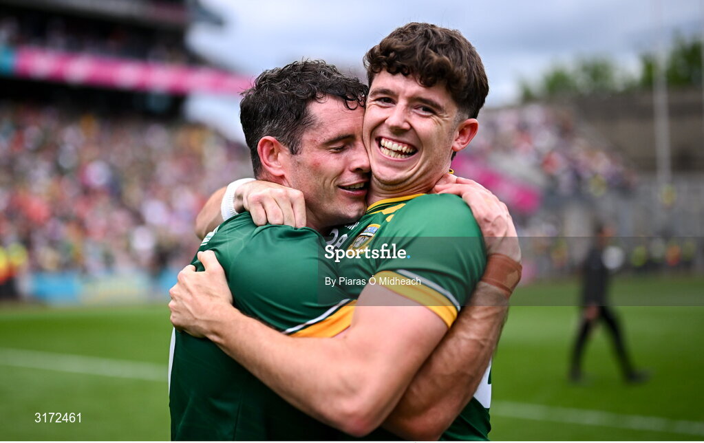 29 June 2025; Meath players Seán Coffey, left, and Keith Curtis celebrate after the GAA Football All-Ireland Senior Championship quarter-final match between Meath and Galway at Croke Park in Dublin. Photo by Piaras Ó Mídheach/Sportsfile