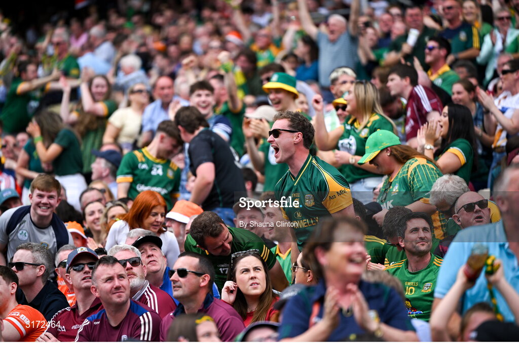 29 June 2025; Meath supporters celebrate after the GAA Football All-Ireland Senior Championship quarter-final match between Meath and Galway at Croke Park in Dublin. Photo by Shauna Clinton/Sportsfile