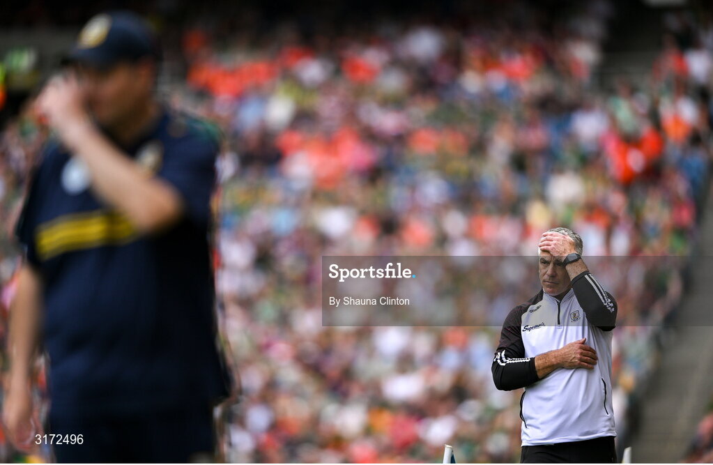 29 June 2025; Galway manager Padraic Joyce, right, and Meath manager Robbie Brennan during the GAA Football All-Ireland Senior Championship quarter-final match between Meath and Galway at Croke Park in Dublin. Photo by Shauna Clinton/Sportsfile