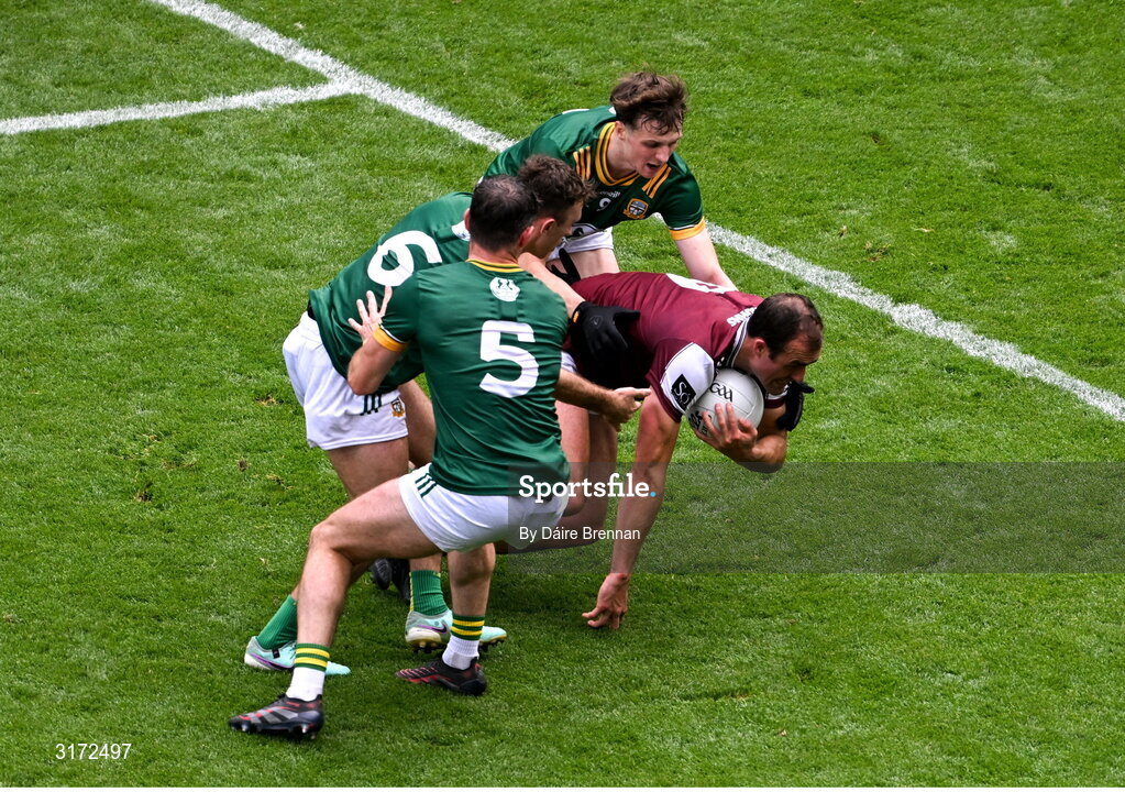 29 June 2025; John Maher of Galway in action against Meath players, left to right, Donal Keogan, Seán Coffey, and Adam O'Neill during the GAA Football All-Ireland Senior Championship quarter-final match between Meath and Galway at Croke Park in Dublin. Photo by Daire Brennan/Sportsfile