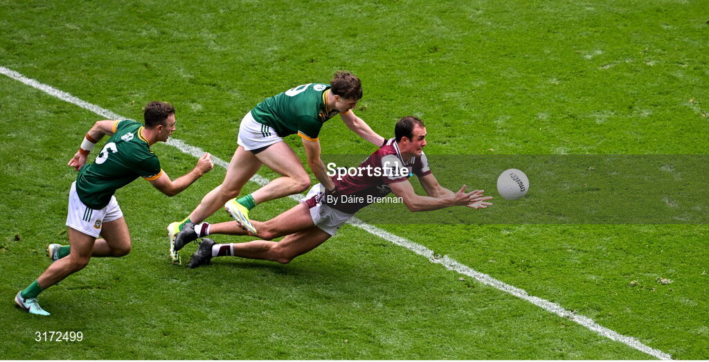 29 June 2025; John Maher of Galway in action against Adam O'Neill of Meath during the GAA Football All-Ireland Senior Championship quarter-final match between Meath and Galway at Croke Park in Dublin. Photo by Daire Brennan/Sportsfile