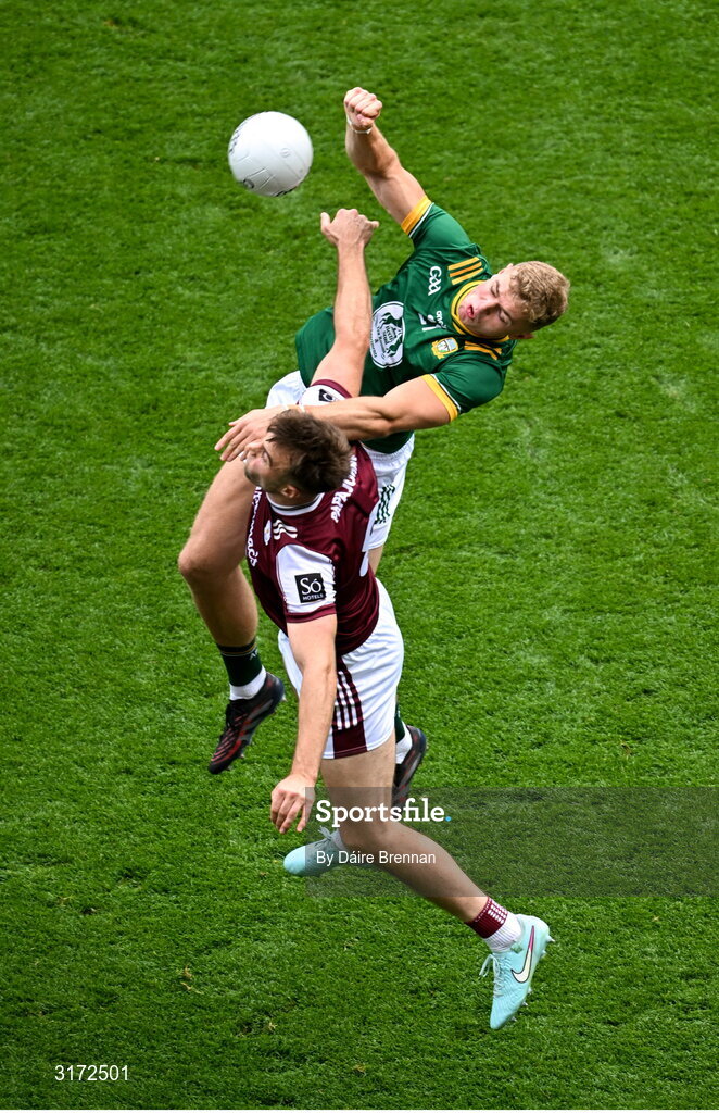 29 June 2025; Conor Gray of Meath in action against Paul Conroy of Galway during the GAA Football All-Ireland Senior Championship quarter-final match between Meath and Galway at Croke Park in Dublin. Photo by Daire Brennan/Sportsfile