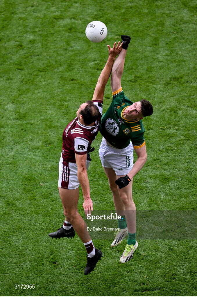 29 June 2025; John Maher of Galway in action against Conor Duke of Meath during the GAA Football All-Ireland Senior Championship quarter-final match between Meath and Galway at Croke Park in Dublin. Photo by Daire Brennan/Sportsfile