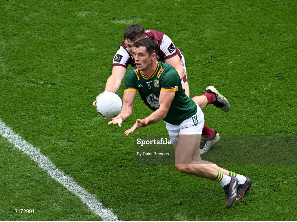 29 June 2025; Donal Keogan of Meath in action against Damien Comer of Galway during the GAA Football All-Ireland Senior Championship quarter-final match between Meath and Galway at Croke Park in Dublin. Photo by Daire Brennan/Sportsfile