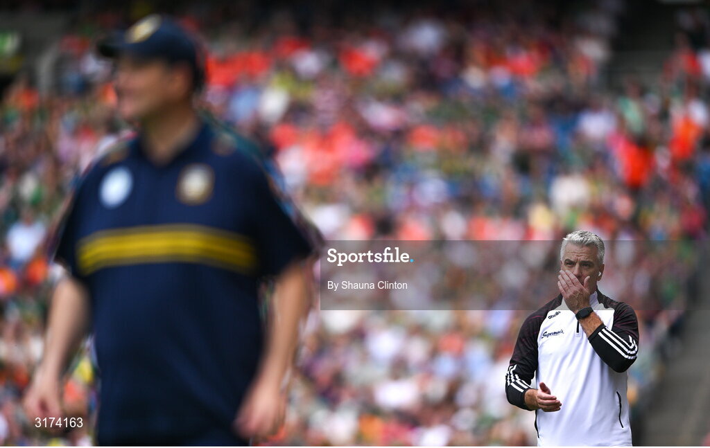 29 June 2025; Galway manager Padraic Joyce, right, and Meath manager Robbie Brennan during the GAA Football All-Ireland Senior Championship quarter-final match between Meath and Galway at Croke Park in Dublin. Photo by Shauna Clinton/Sportsfile