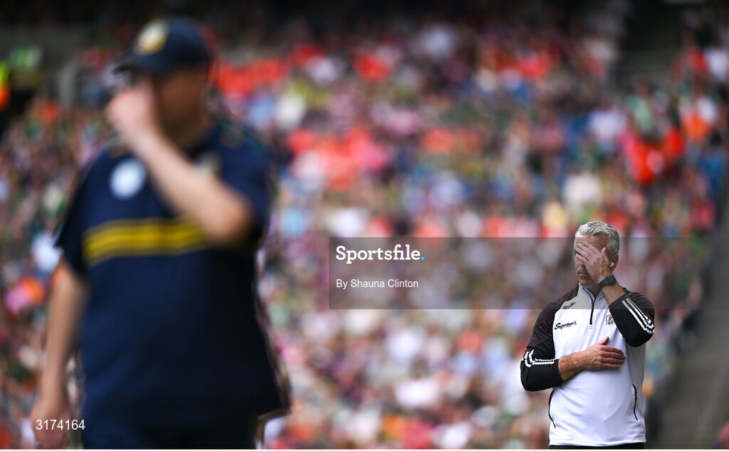 29 June 2025; Galway manager Padraic Joyce, right, and Meath manager Robbie Brennan during the GAA Football All-Ireland Senior Championship quarter-final match between Meath and Galway at Croke Park in Dublin. Photo by Shauna Clinton/Sportsfile