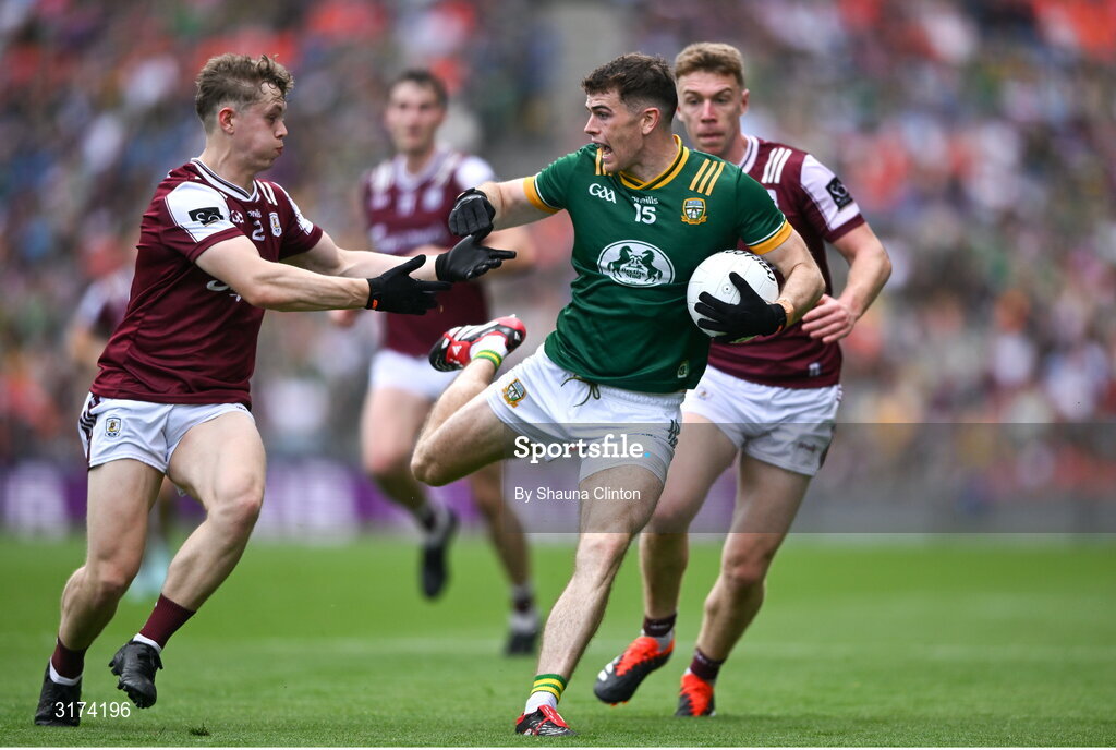 29 June 2025; Eoghan Frayne of Meath in action against Johnny McGrath of Galway during the GAA Football All-Ireland Senior Championship quarter-final match between Meath and Galway at Croke Park in Dublin. Photo by Shauna Clinton/Sportsfile