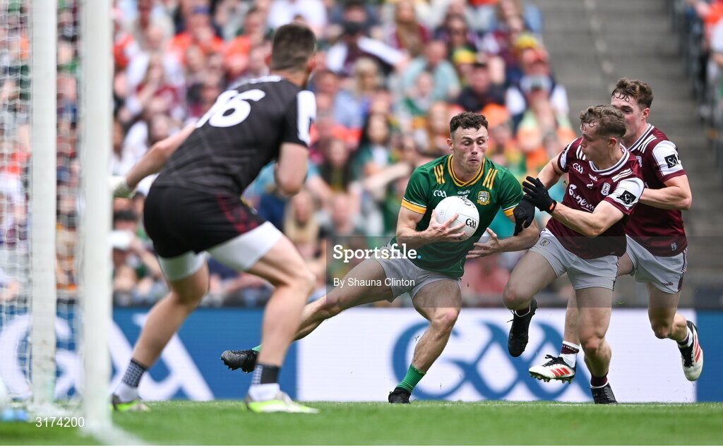 29 June 2025; Jordan Morris of Meath in action against Johnny McGrath of Galway during the GAA Football All-Ireland Senior Championship quarter-final match between Meath and Galway at Croke Park in Dublin. Photo by Shauna Clinton/Sportsfile