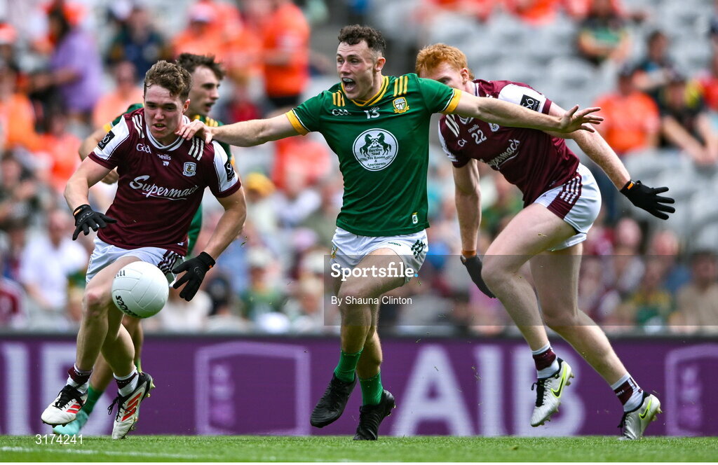 29 June 2025; Jack Glynn of Galway is tackled by Jordan Morris of Meath during the GAA Football All-Ireland Senior Championship quarter-final match between Meath and Galway at Croke Park in Dublin. Photo by Shauna Clinton/Sportsfile