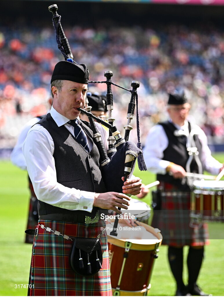 29 June 2025; Pat Nolan, centre, playing with the St Joseph's Pipe Band in Clondalkin in Dublin at half-time in the GAA Football All-Ireland Senior Championship quarter-final match between Meath and Galway at Croke Park in Dublin. Photo by Piaras Ó Mídheach/Sportsfile