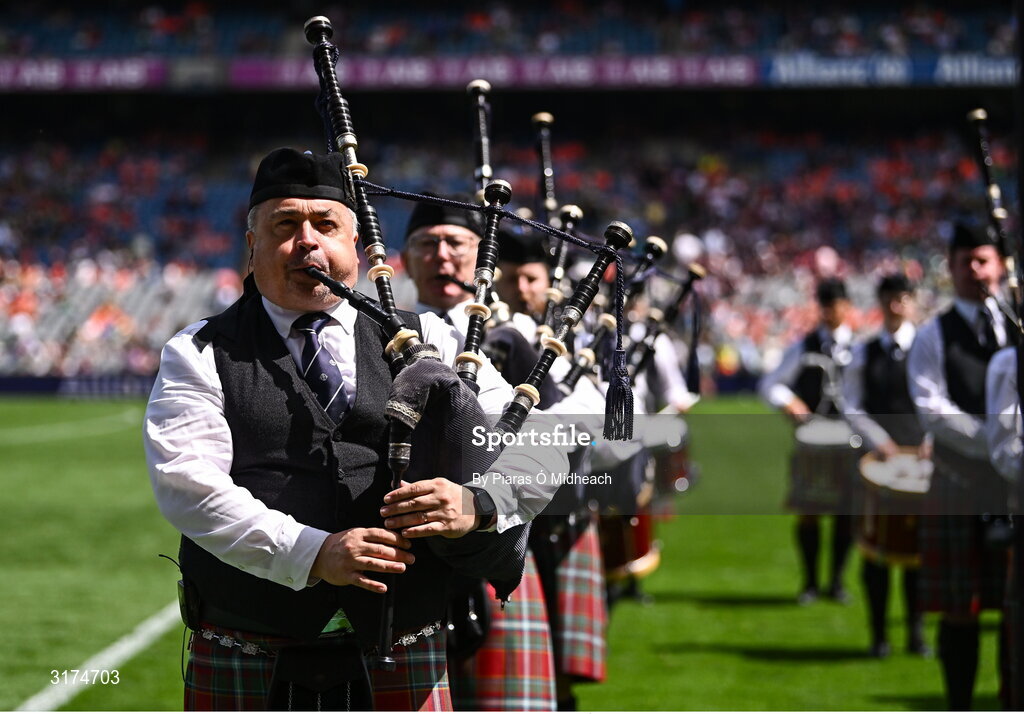 29 June 2025; The St Joseph's Pipe Band from Clondalkin in Dublin performing at half-time in the GAA Football All-Ireland Senior Championship quarter-final match between Meath and Galway at Croke Park in Dublin. Photo by Piaras Ó Mídheach/Sportsfile
