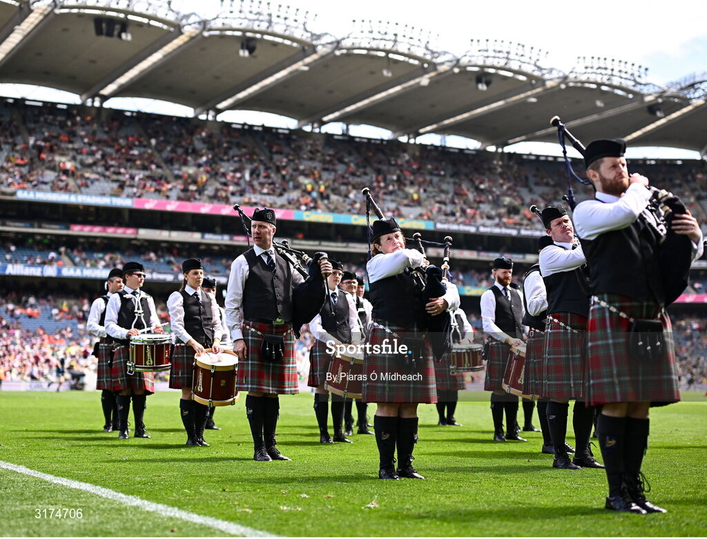29 June 2025; The St Joseph's Pipe Band from Clondalkin in Dublin performing at half-time in the GAA Football All-Ireland Senior Championship quarter-final match between Meath and Galway at Croke Park in Dublin. Photo by Piaras Ó Mídheach/Sportsfile