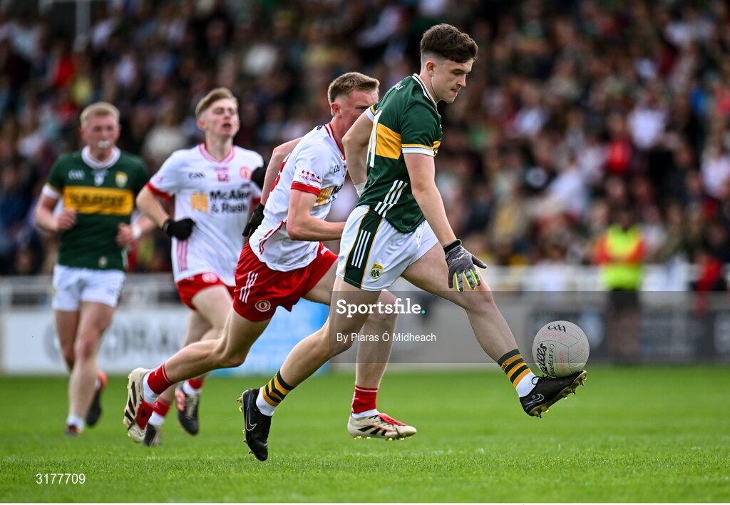 6 July 2025; Gearóid White of Kerry gets away from Darren McAnespie of Tyrone during the Electric Ireland GAA Football All-Ireland Minor Championship final match between Kerry and Tyrone at Cedral St Conleth's Park in Newbridge, Kildare. Photo by Piaras Ó Mídheach/Sportsfile
