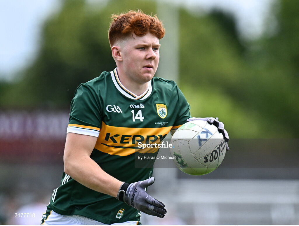 6 July 2025; Kevin Griffin of Kerry during the Electric Ireland GAA Football All-Ireland Minor Championship final match between Kerry and Tyrone at Cedral St Conleth's Park in Newbridge, Kildare. Photo by Piaras Ó Mídheach/Sportsfile