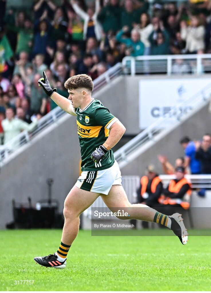 6 July 2025; Ben Kelliher of Kerry celebrates scoring his side's first goal during the Electric Ireland GAA Football All-Ireland Minor Championship final match between Kerry and Tyrone at Cedral St Conleth's Park in Newbridge, Kildare. Photo by Piaras Ó Mídheach/Sportsfile
