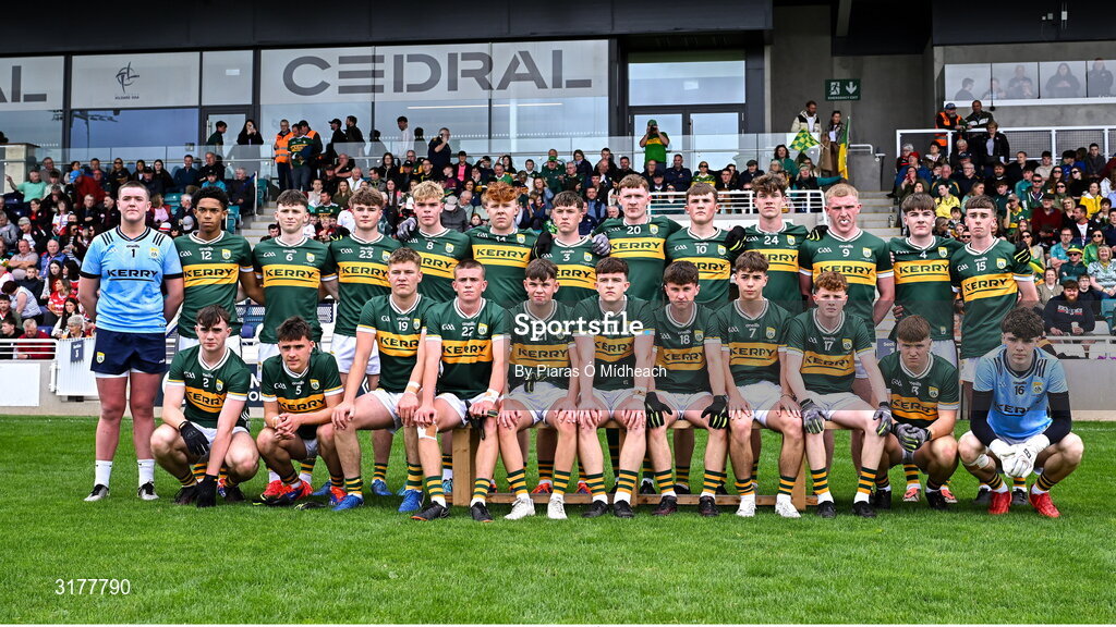 6 July 2025; The Kerry squad before the Electric Ireland GAA Football All-Ireland Minor Championship final match between Kerry and Tyrone at Cedral St Conleth's Park in Newbridge, Kildare. Photo by Piaras Ó Mídheach/Sportsfile