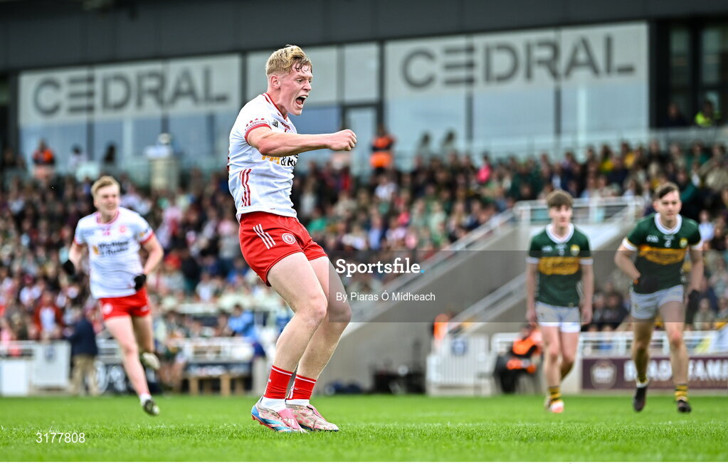 6 July 2025; Peter Colton of Tyrone celebrates after scoring his side's first goal, a penalty, during the Electric Ireland GAA Football All-Ireland Minor Championship final match between Kerry and Tyrone at Cedral St Conleth's Park in Newbridge, Kildare. Photo by Piaras Ó Mídheach/Sportsfile