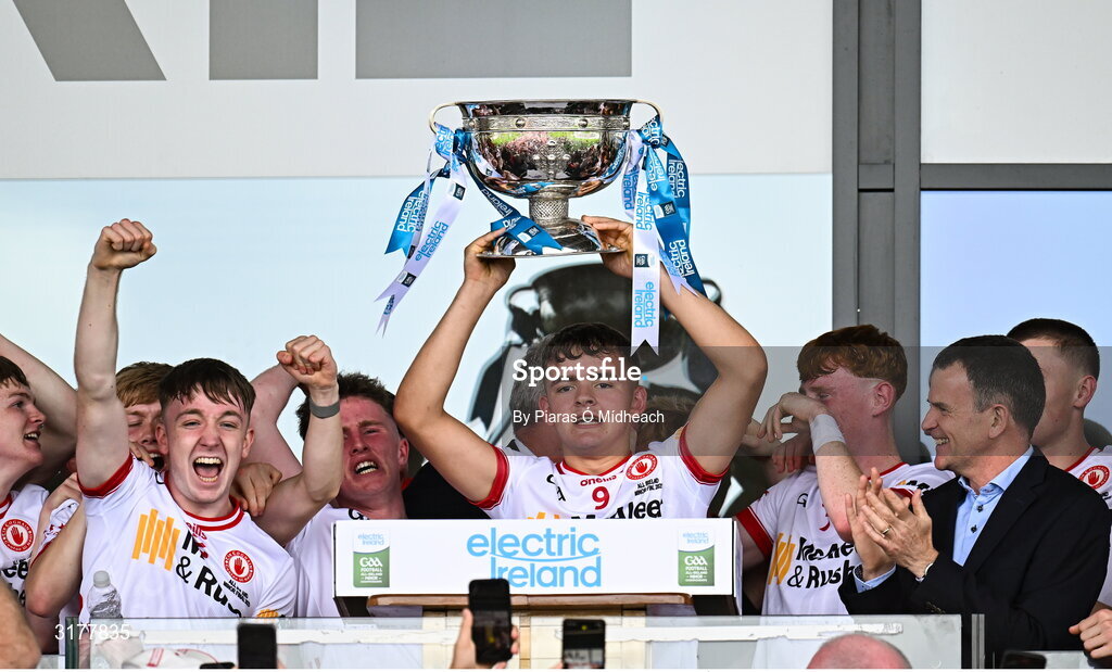 6 July 2025; Pádraig Donaghy of Tyrone lifts the cup after the Electric Ireland GAA Football All-Ireland Minor Championship final match between Kerry and Tyrone at Cedral St Conleth's Park in Newbridge, Kildare. Photo by Piaras Ó Mídheach/Sportsfile
