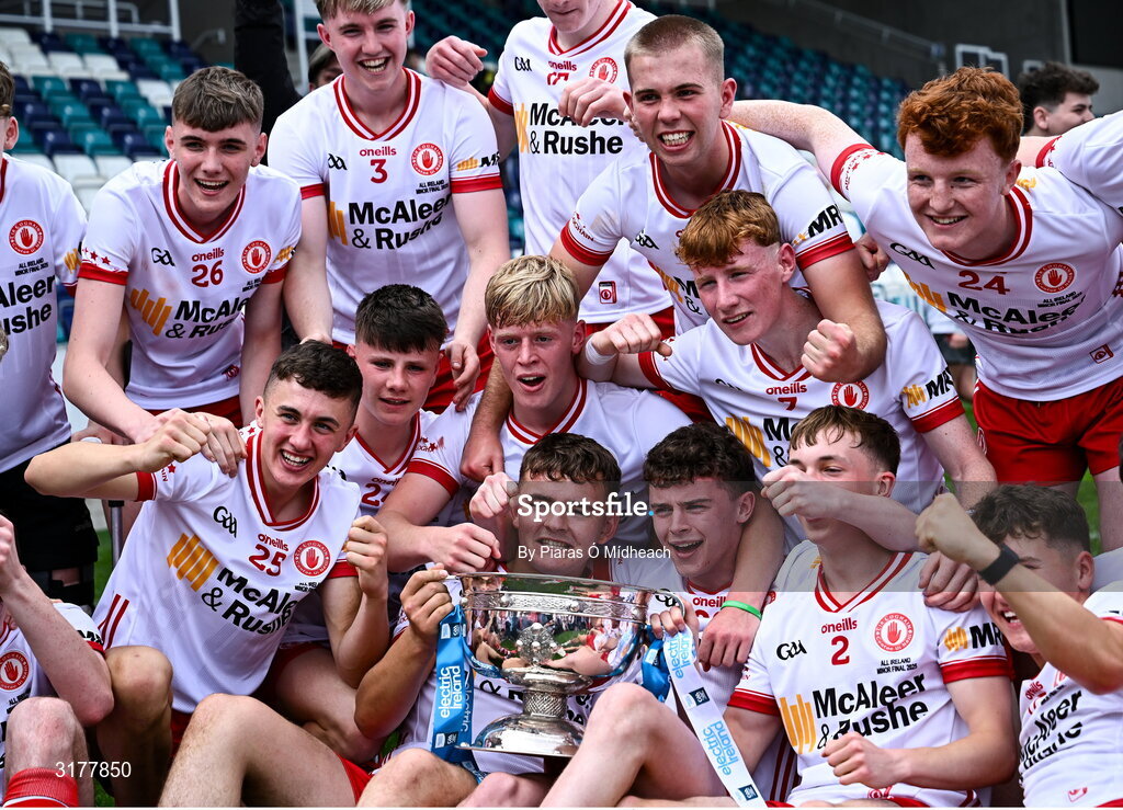 6 July 2025; The Tyrone team celebrate with the cup after the Electric Ireland GAA Football All-Ireland Minor Championship final match between Kerry and Tyrone at Cedral St Conleth's Park in Newbridge, Kildare. Photo by Piaras Ó Mídheach/Sportsfile