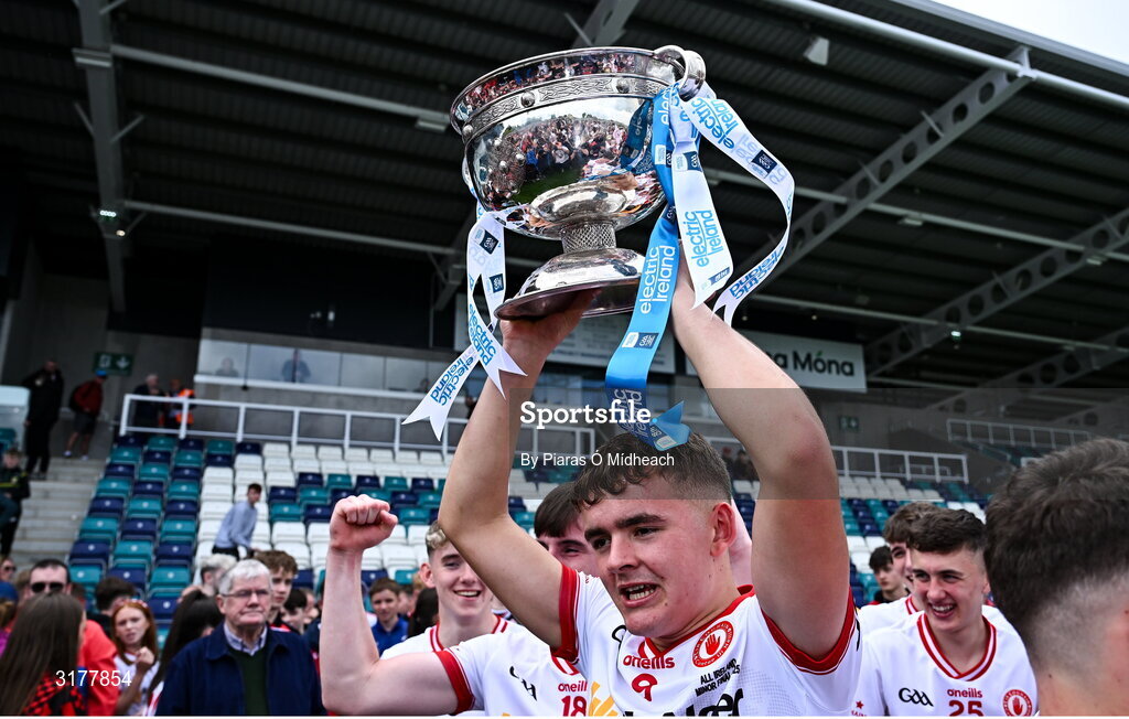 6 July 2025; Pádraig Donaghy of Tyrone celebrates with the cup after the Electric Ireland GAA Football All-Ireland Minor Championship final match between Kerry and Tyrone at Cedral St Conleth's Park in Newbridge, Kildare. Photo by Piaras Ó Mídheach/Sportsfile