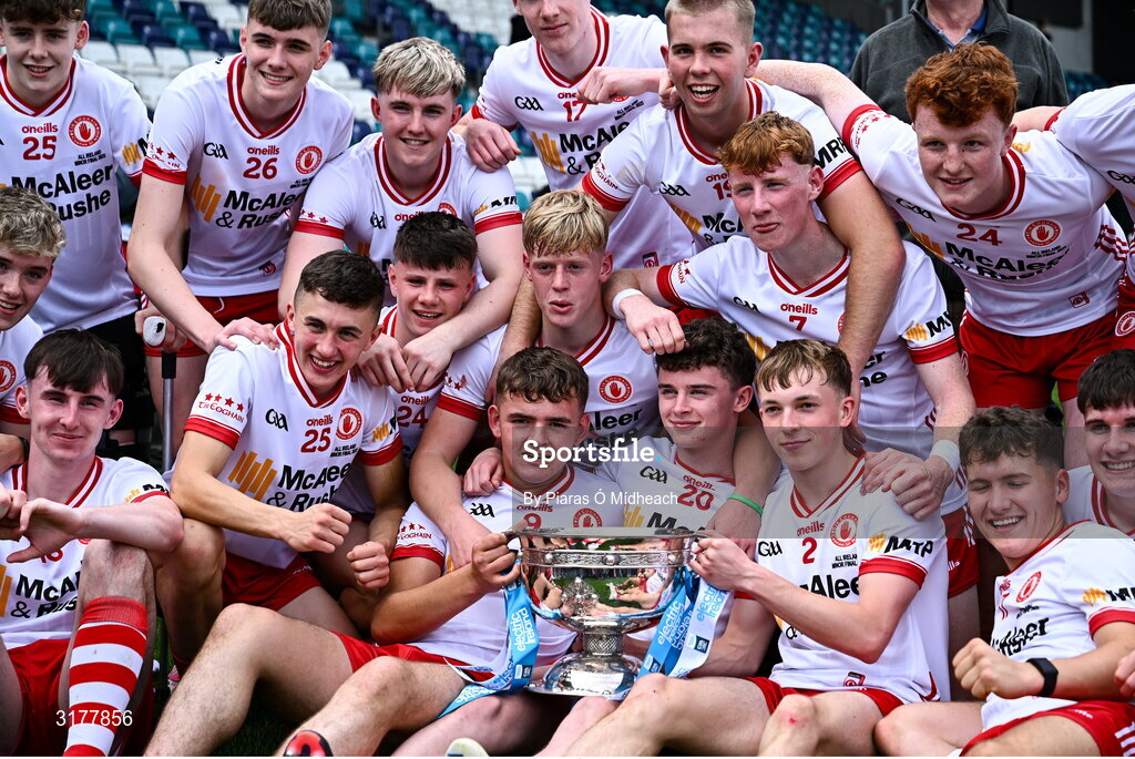 6 July 2025; The Tyrone team celebrate with the cup after the Electric Ireland GAA Football All-Ireland Minor Championship final match between Kerry and Tyrone at Cedral St Conleth's Park in Newbridge, Kildare. Photo by Piaras Ó Mídheach/Sportsfile