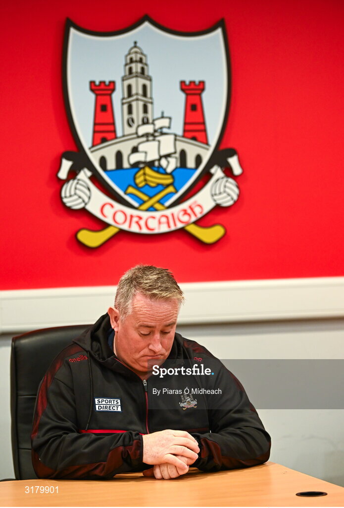 7 July 2025; Cork manager Pat Ryan checks his watch as he waits for the start of a Cork Hurling media conference at SuperValu Páirc Uí Chaoimh in Cork ahead of the GAA Hurling All-Ireland Senior Championship Final. Photo by Piaras Ó Mídheach/Sportsfile