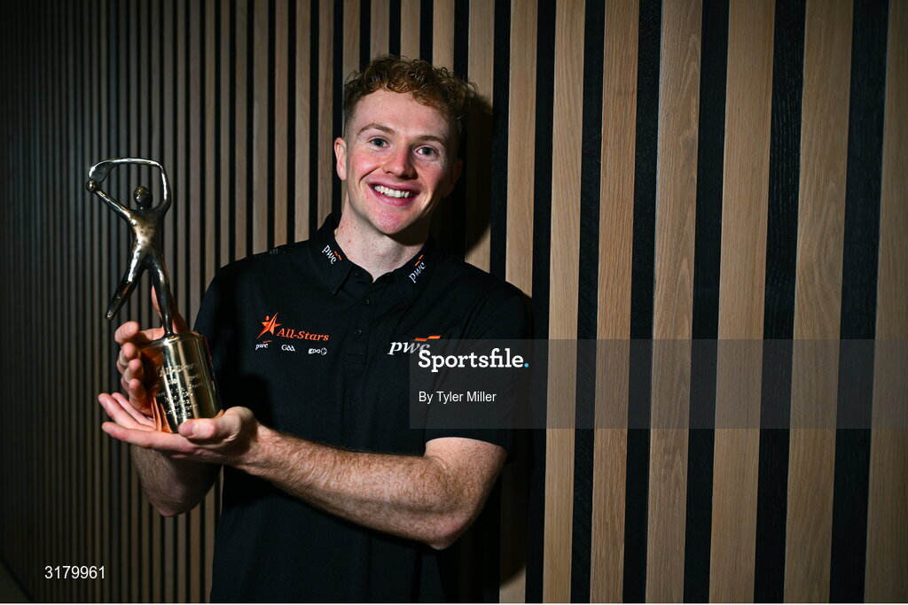 8 July 2025; PwC GAA/GPA Player of the Month for June in hurling, Conor Burke of Dublin, with his award at PwC offices in Dublin. Photo by Tyler Miller/Sportsfile