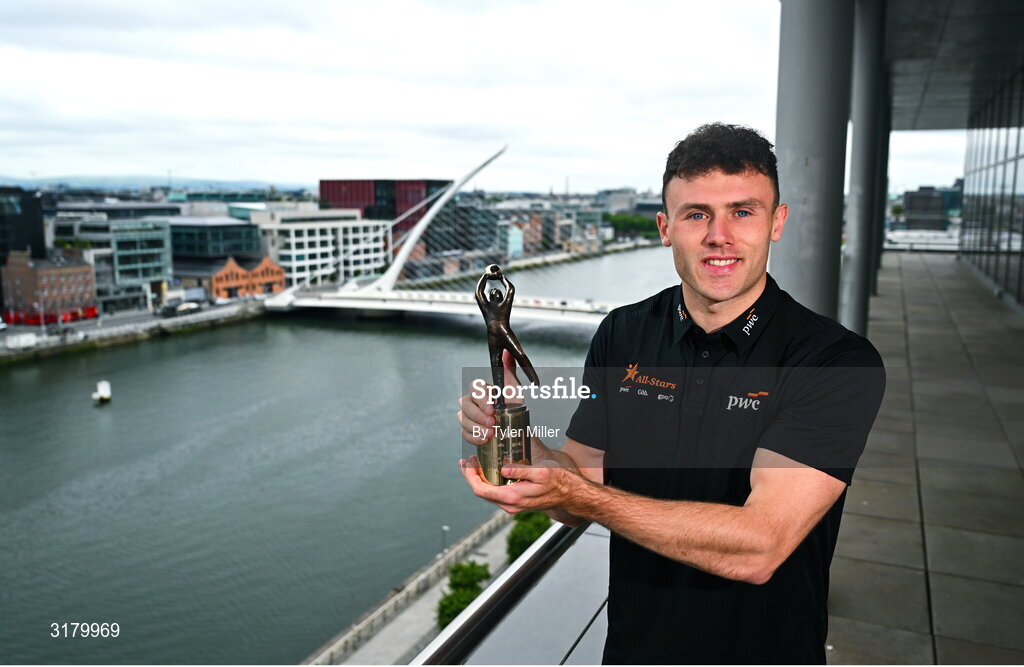 8 July 2025; PwC GAA/GPA Player of the Month for June in football, Jordan Morris of Meath, with his award at PwC offices in Dublin. Photo by Tyler Miller/Sportsfile