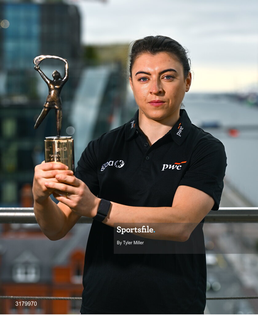 8 July 2025; PwC GPA Player of the Month for April in camogie, Niamh Mallon of Galway, with her award at PwC’s offices in Dublin. Photo by Tyler Miller/Sportsfile