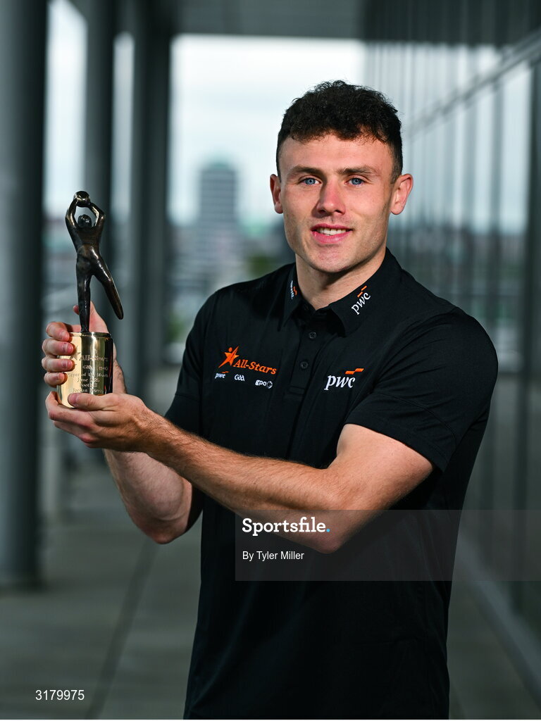 8 July 2025; PwC GAA/GPA Player of the Month for June in football, Jordan Morris of Meath, with his award at PwC offices in Dublin. Photo by Tyler Miller/Sportsfile