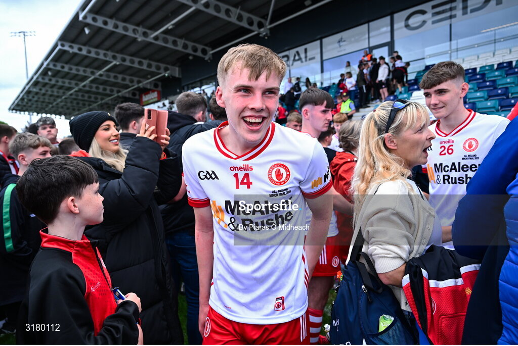 6 July 2025; Eoin Long of Tyrone celebrates after the Electric Ireland GAA Football All-Ireland Minor Championship final match between Kerry and Tyrone at Cedral St Conleth's Park in Newbridge, Kildare. Photo by Piaras Ó Mídheach/Sportsfile
