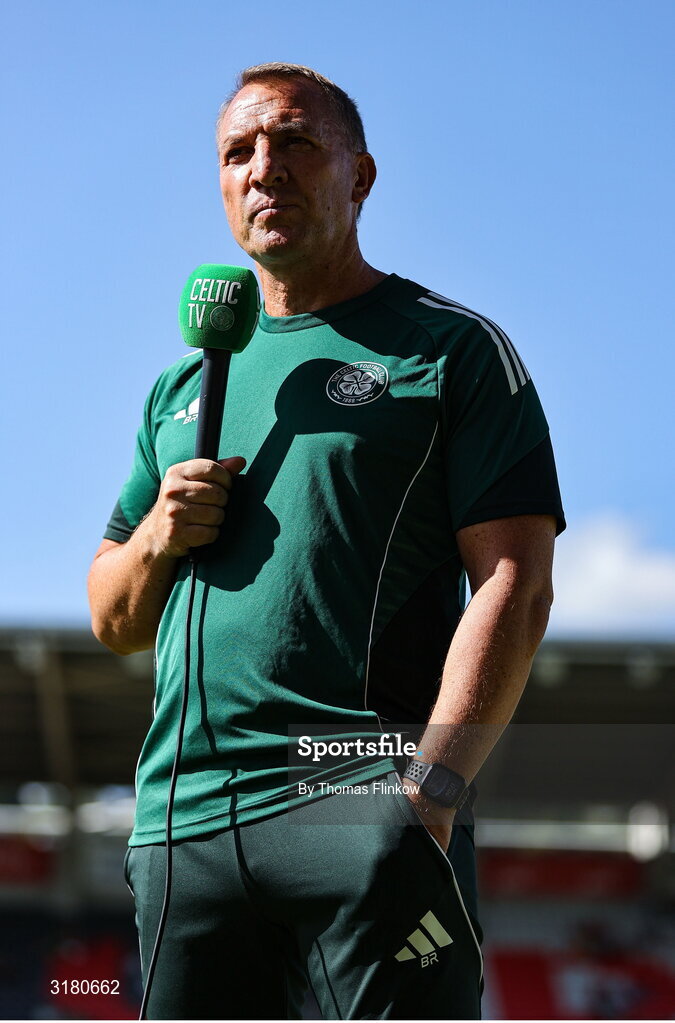 8 July 2025; Celtic manager Brendan Rogers is interviewed before the Cork Super Cup match between Cork City and Celtic FC at SuperValu Páirc Uí Chaoimh in Cork. Photo by Thomas Flinkow/Sportsfile