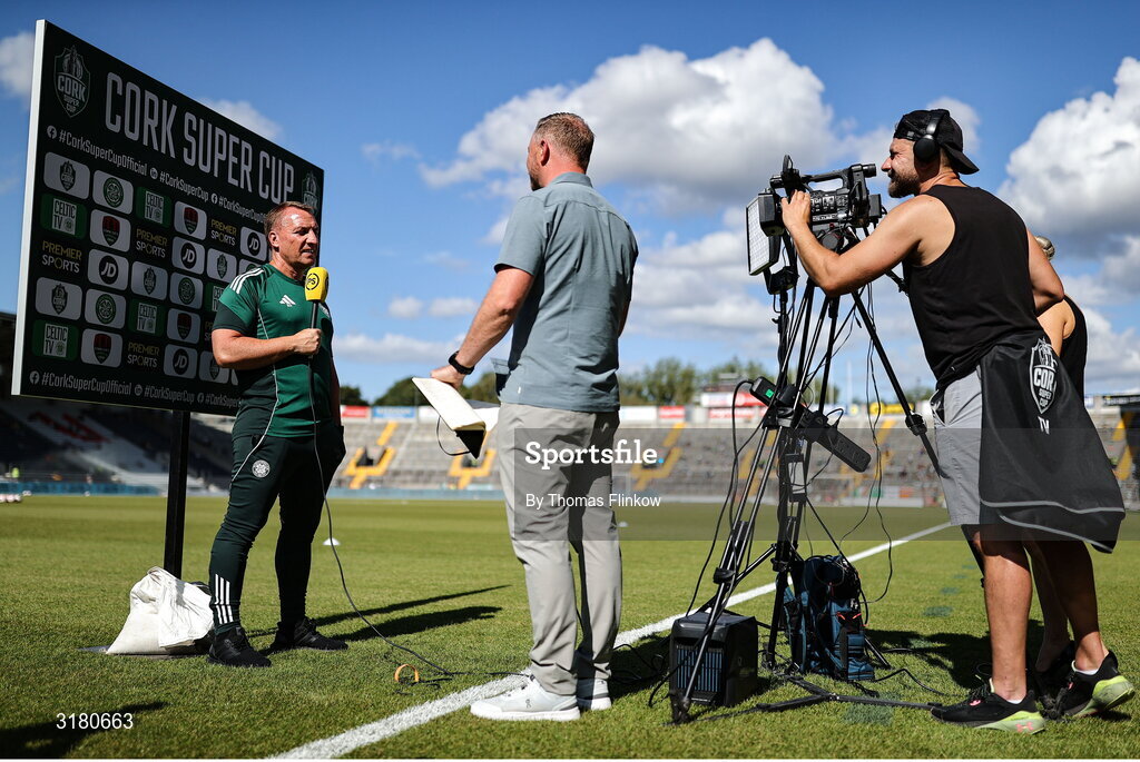 8 July 2025; Celtic manager Brendan Rogers is interviewed before the Cork Super Cup match between Cork City and Celtic FC at SuperValu Páirc Uí Chaoimh in Cork. Photo by Thomas Flinkow/Sportsfile