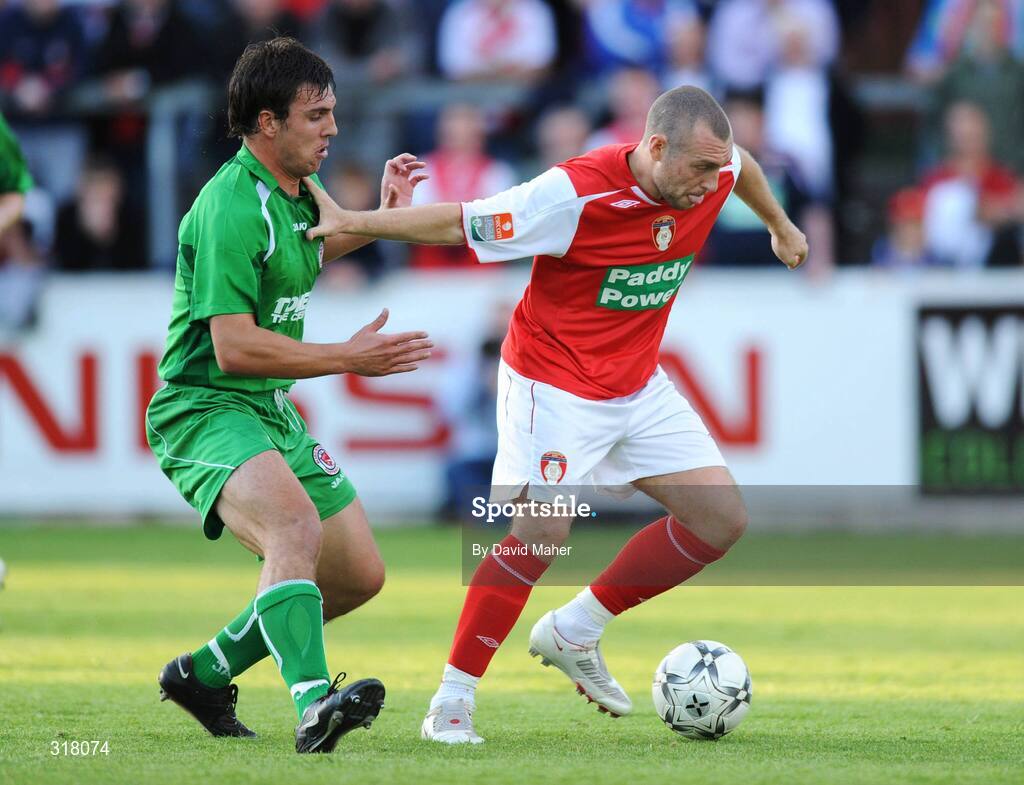 24 August 2008; Mark Quigley, St. Patrick's Athletic, in action against Gavin Peers, Sligo Rovers. eircom League of Ireland Premier Division, St. Patrick's Athletic v Sligo Rovers, Richmond Park, Dublin. Picture credit: David Maher / SPORTSFILE