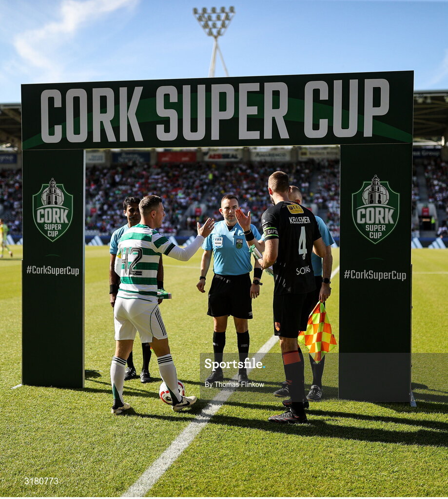 8 July 2025; Celtic captain Callum McGregor and Cork City captain Fiacre Kelleher of Cork City shake hands before the Cork Super Cup match between Cork City and Celtic FC at SuperValu Páirc Uí Chaoimh in Cork. Photo by Thomas Flinkow/Sportsfile