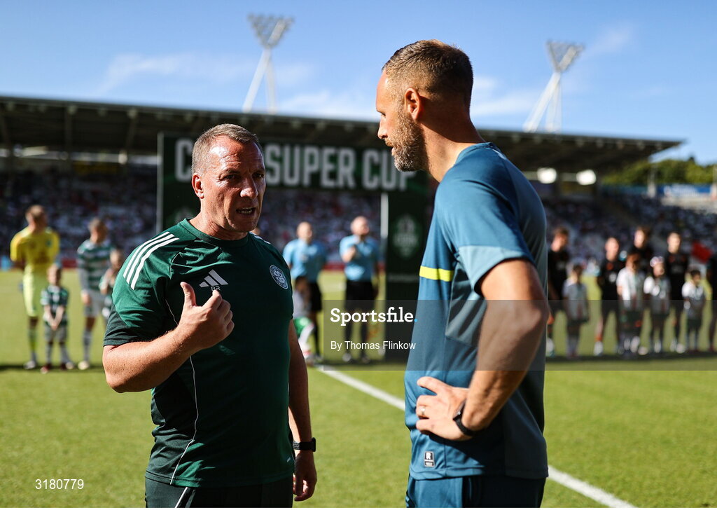 8 July 2025; Celtic manager Brendan Rodgers, left, and Cork City assistant manager David Meyler before the Cork Super Cup match between Cork City and Celtic FC at SuperValu Páirc Uí Chaoimh in Cork. Photo by Thomas Flinkow/Sportsfile