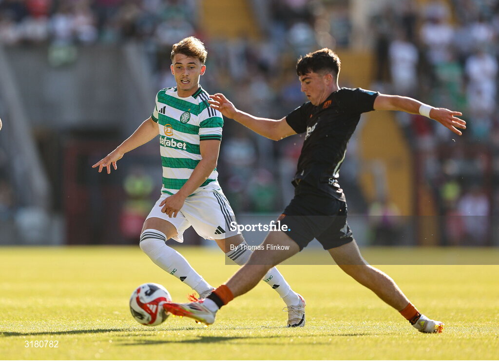 8 July 2025; Callum Osmand of Celtic in action against Matthew Kiernan of Cork City during the Cork Super Cup match between Cork City and Celtic FC at SuperValu Páirc Uí Chaoimh in Cork. Photo by Thomas Flinkow/Sportsfile