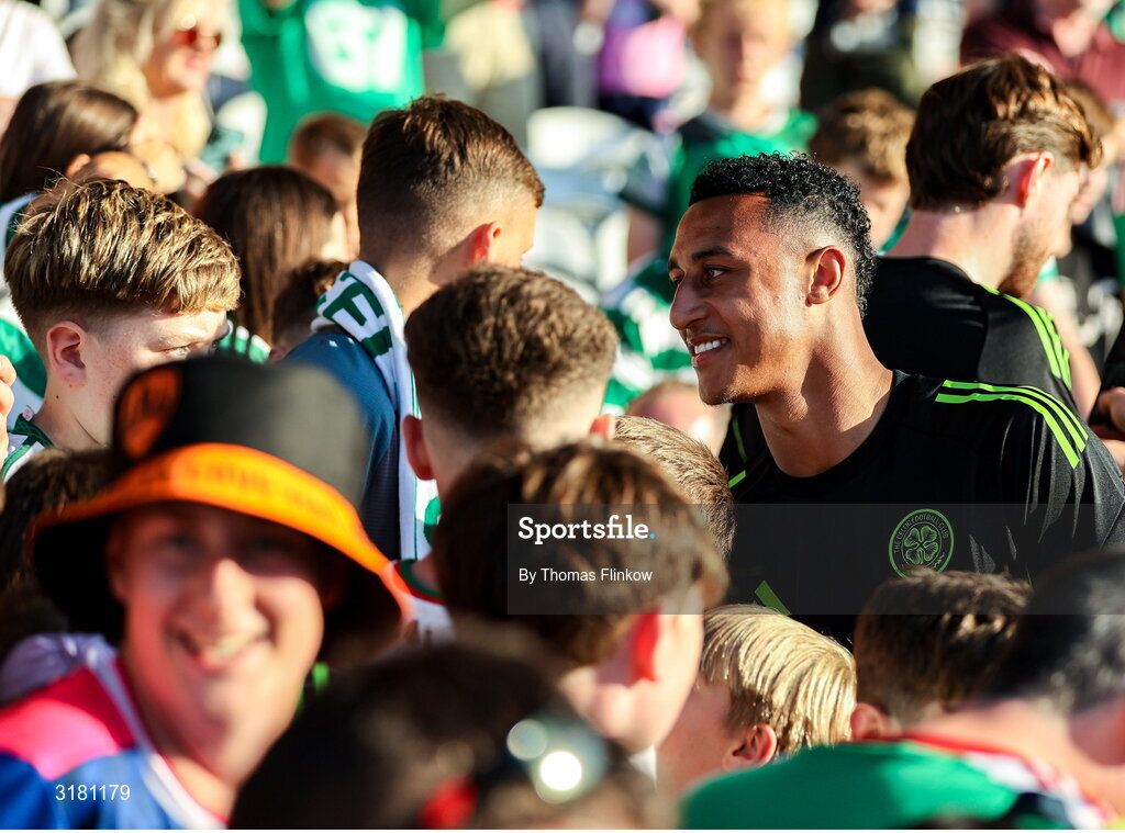 8 July 2025; Adam Idah of Celtic with supporters after the Cork Super Cup match between Cork City and Celtic FC at SuperValu Páirc Uí Chaoimh in Cork. Photo by Thomas Flinkow/Sportsfile