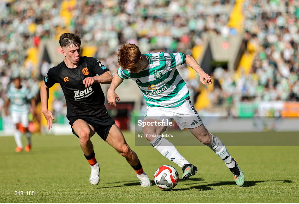 8 July 2025; Ben Summers of Celtic in action against Cathal O'Sullivan of Cork City during the Cork Super Cup match between Cork City and Celtic FC at SuperValu Páirc Uí Chaoimh in Cork. Photo by Thomas Flinkow/Sportsfile