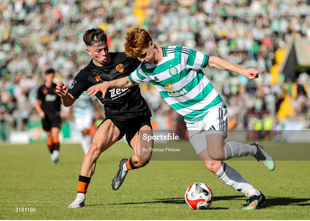 8 July 2025; Ben Summers of Celtic in action against Cathal O'Sullivan of Cork City during the Cork Super Cup match between Cork City and Celtic FC at SuperValu Páirc Uí Chaoimh in Cork. Photo by Thomas Flinkow/Sportsfile