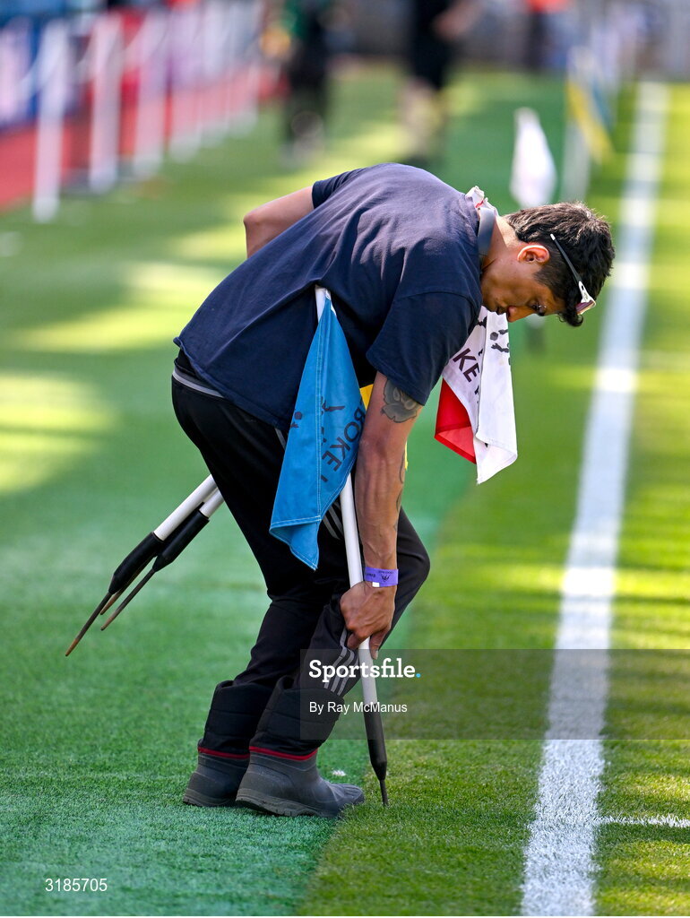 13 July 2025; Lucas Lautimdo, a member of the groundstaff, places sideline flags before the GAA Football All-Ireland Senior Championship semi-final match between Meath and Donegal at Croke Park in Dublin. Photo by Ray McManus/Sportsfile