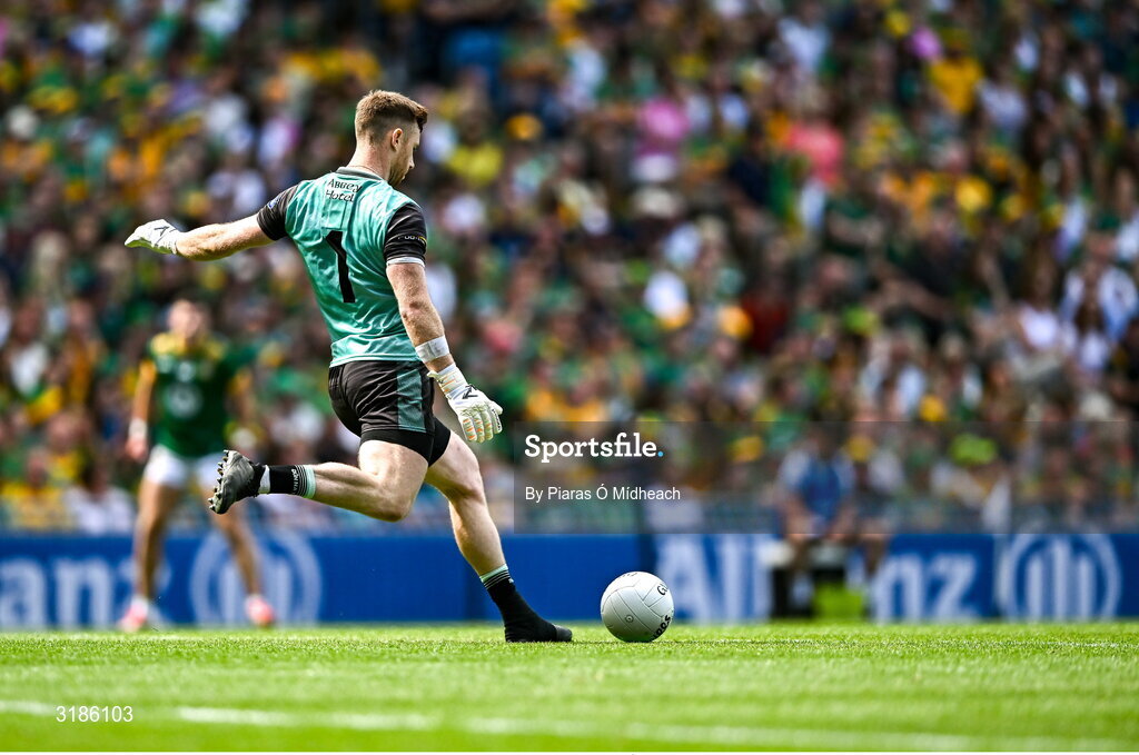 13 July 2025; Donegal goalkeeper Shaun Patton takes a kick-out the GAA Football All-Ireland Senior Championship semi-final match between Meath and Donegal at Croke Park in Dublin. Photo by Piaras Ó Mídheach/Sportsfile