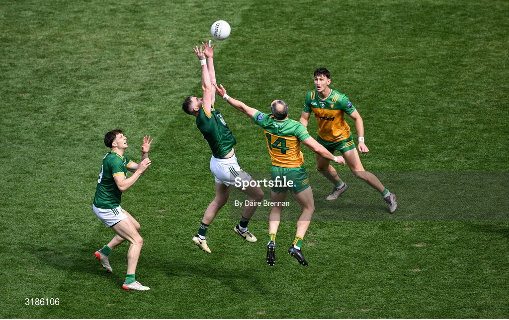13 July 2025; Bryan Menton of Meath in action against Michael Murphy of Donegal during the GAA Football All-Ireland Senior Championship semi-final match between Meath and Donegal at Croke Park in Dublin. Photo by Daire Brennan/Sportsfile
