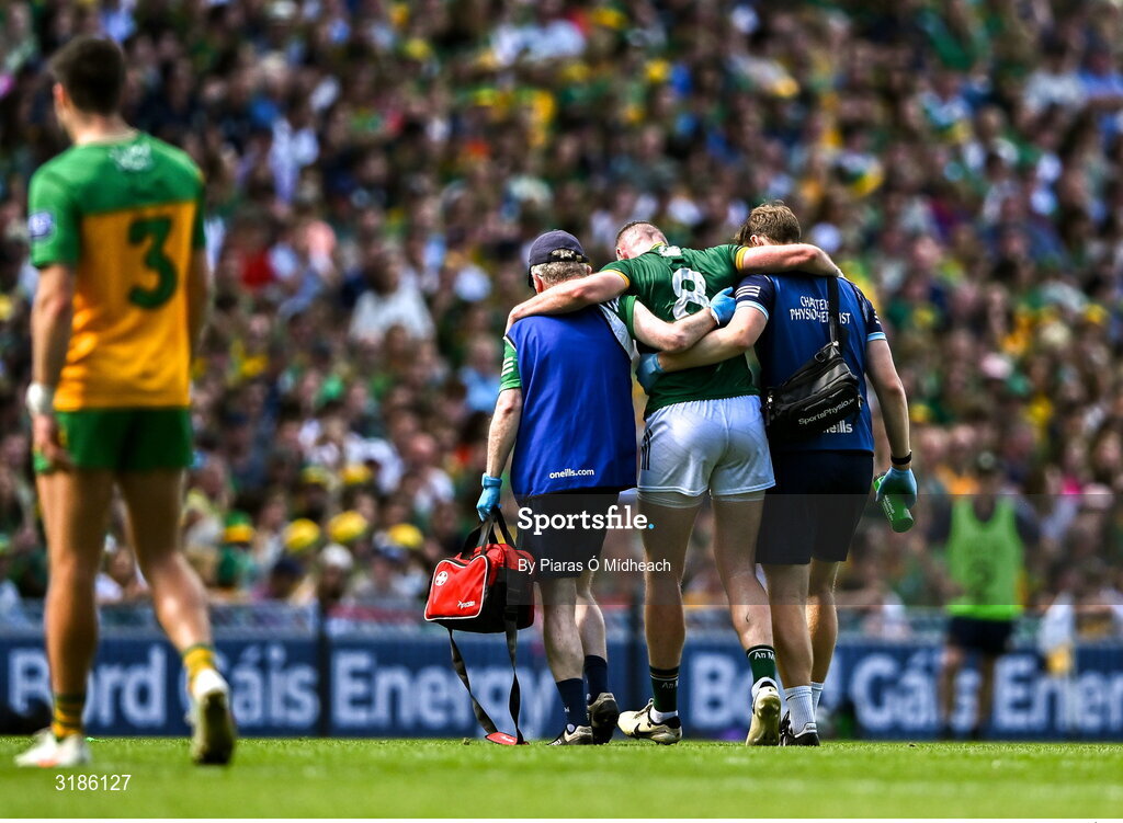 13 July 2025; Bryan Menton of Meath leaves the pitch to receive medical attention for an injury during the GAA Football All-Ireland Senior Championship semi-final match between Meath and Donegal at Croke Park in Dublin. Photo by Piaras Ó Mídheach/Sportsfile